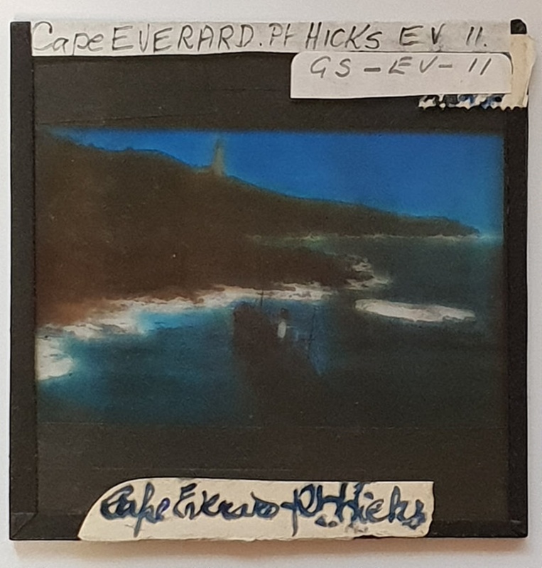 The first depicts the Point Hicks lighthouse on the coastal headland in the East Gippsland region of Victoria. This image shows the rough sea as it crashes on the rocks. The lighthouse stands on a slope in the background. A ship 'Cape Everard' is in the foreground.