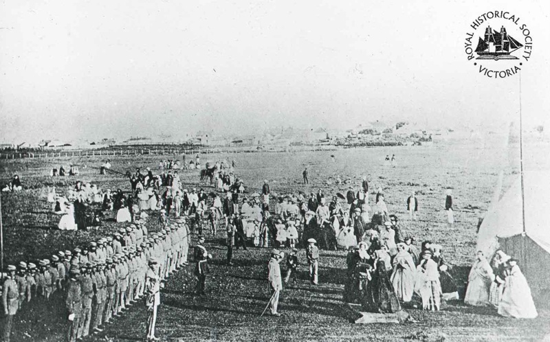 Inscription and MarksInscribed in black ink on verso : Port Fairy Volunteer Corps / Formed in 1855 / Photograph taken at parade / held on the Port Fairy Cricket / Ground in 1856, when a silver / bugle was presented to the corps / by Mrs Wm Rutledge on the behalf / of the ladies of Port Fairy / [copied from photograph in / the possession of Miss Ethel Flower / 25 Wattletree Road / Malvern]"