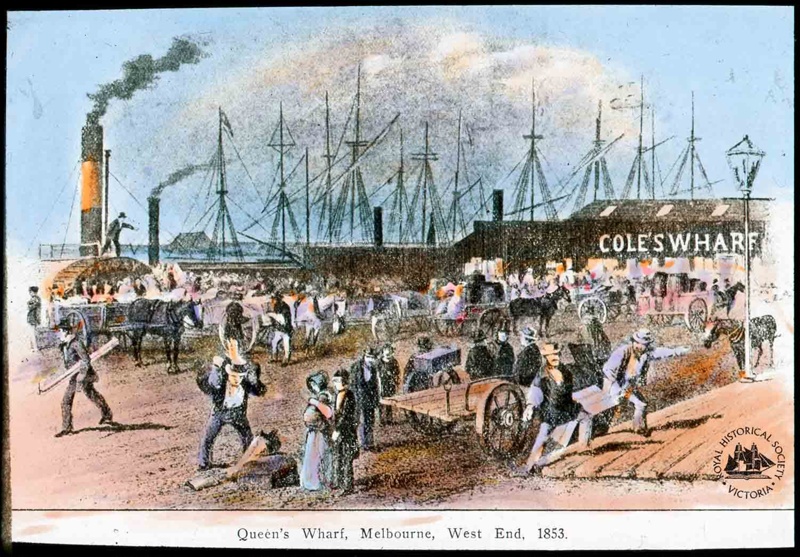 Queens Wharf was cut off by the construction of the Spencer St Bridge in 1927. Other names associated with the location : Coles Wharf, Coltherds Shipsmiths, Coltherds Wharf, Hughes Wharf, La Trobe Wharf, Raleighs Wharf.
