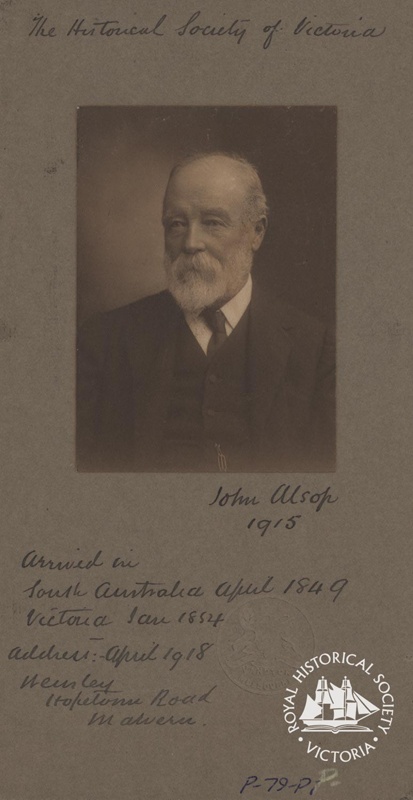 Inscribed in black pen under image : 'John Alsop / 1915 / arrived in / South Australia April 1849 / Victoria Jan 1854 / address: April 1918 / Wensley / Hopetoun / Road Malvern."