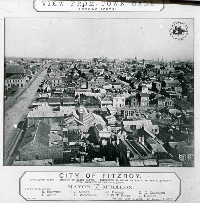 Inscription and MarksTop: VIEW FROM TOWN HALL / (LOOKING SOUTH) / Bottom: CITY OF FITZROY / Population, 19,500 Amount of Rates, £12,700 Estimated Value of Rateable Property, £1,539,470. / MAYOR: J. McMAHON. / Councillors R. Showers J. Moore E. Brooks G. C. Clauscen / S. Lyons B. Woodhead F. W. T. Evans J. Holden / August 1880 Town Clerk: John B. Jones / City Surveyor: F. Cooze