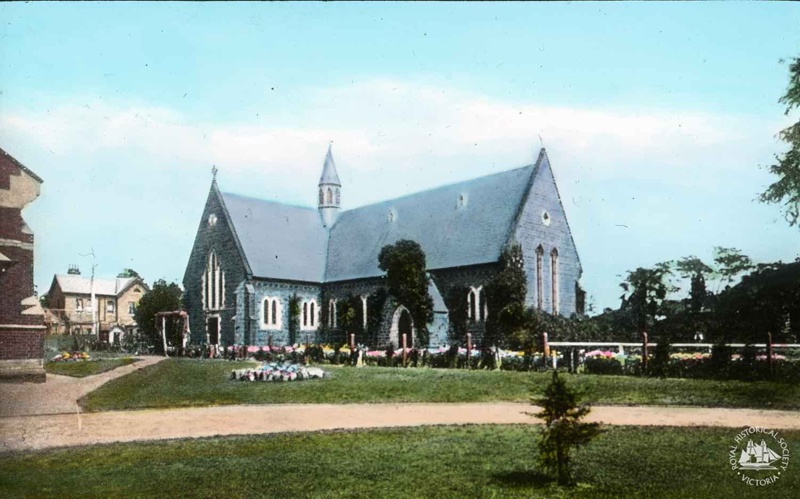 About this objectThe photograph of this church from taken from Glenferrie Road from the south-west. Today the church is hidden behind large trees at 296 Glenferrie Road, but when this photograph was taken the churchyard was edged in a low colourful flowerbed. The house to the rear and right of the church is possibly the manse. The image is quite grainy suggesting that the slide was made from a photograph in a newspaper or a book.