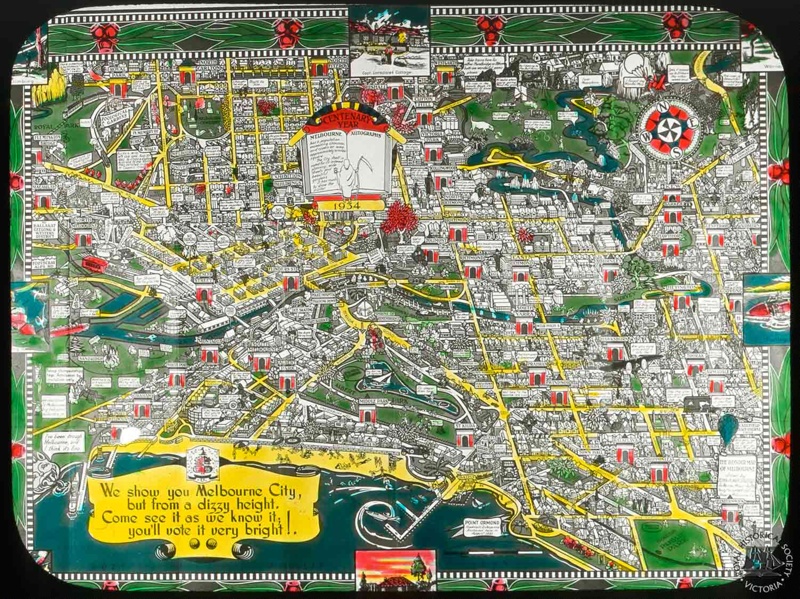 Name/TitleThe Wondermap of Melbourne; an aerial perspective drawing of Melbourne, from Royal Park to Glenferrie (in north) and Port Melbourne to Elsternwick (in south), 1934