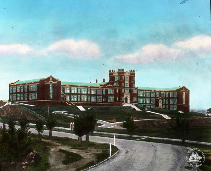 The school was built on a 12.5 acre site in 1927 for boy pupils moved from the dilapidated and cramped Spring Street Melbourne Continuation School, which was Victoria's first state secondary school founded in 1905. The building is a heritage-listed, three-storey rendered brick building in the Collegiate Gothic style, a subgenre of Gothic Revival architecture. It has north and south wings with protruding end bays, a central hall, and imposing entrance tower with crenellated octagonal turrets. The building is constructed of bricks made on site from local clay.