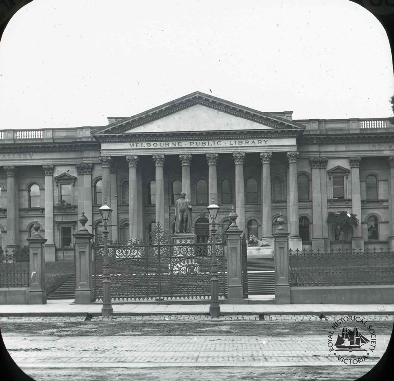 The two bronze lions flanking the entry, installed during the 1860s, can just be seen, with a memorial statue of Sir Redmond Barry on the central landing of the main stairs, placed in 1887.