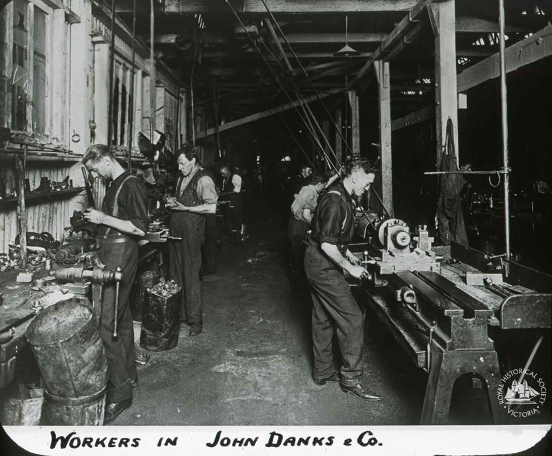 About this objectThis photograph has been taken inside one of the John Danks & Sons factory buildings located at Moray Street, South Melbourne. The workers are engaged in a machine engineering process.