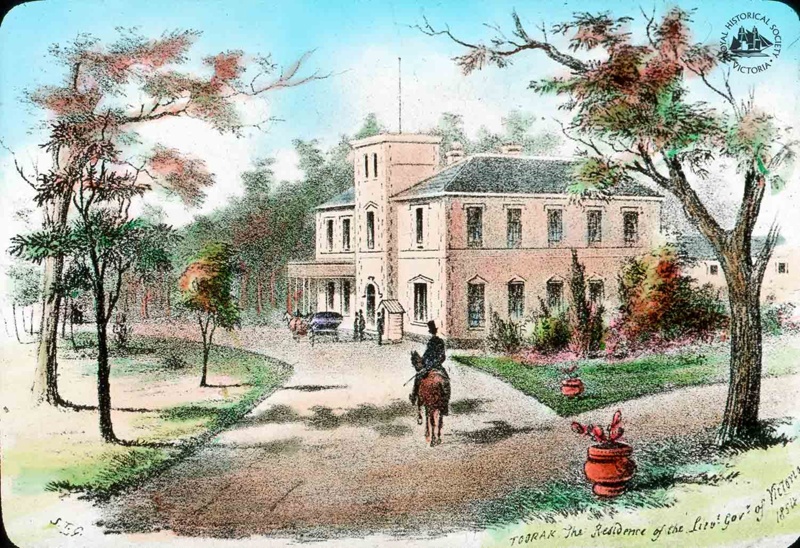 Toorak house was the residence of the Governor of Victoria from 1854 to 1876. This Italianate Victorian style mansion was originally built, c. 1848-51, for Melbourne merchant James Jackson of Jackson, Rae & Co, to a design by architect Samuel Jackson, no relation, but James never occupied the building, dying in 1851. The house's and subsequently the suburb's name, Toorak, is believed to be from the Woiwurrung language meaning black crow or reedy swamp.