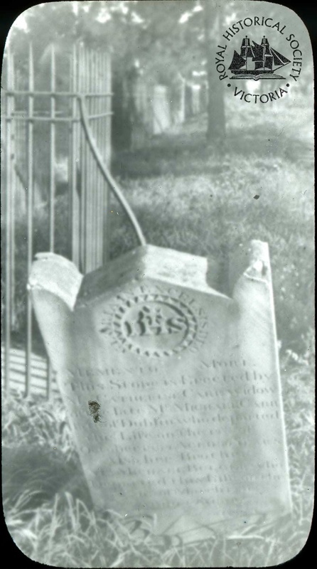 This image is attributed to Everard Studley Miller who photographed many graves and tombstones in the Old Melbourne Cemetery (established in 1837) in the 1920s as part of a project led by Isaac Selby to record and commemorate all aspects of Melbourne's second cemetery (the first being at Flagstaff Hill). The RHSV holds original glass negatives and albums of the photographs from this project.