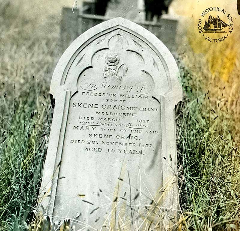 About this objectColourised photograph of the headstone placed over the remains of the wife of Skene Craig, Mary, and his son, Frederick William. Selby writes in his "Memorial History of Melbourne" that, "Garryowen tells us that John Smith, a shepherd, was the first interred in the Old Cemetery, and that the second was Frederick William, the son of Skene Craig." (p.5)