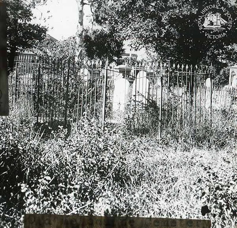 This image is attributed to Everard Studley Miller who photographed many graves and tombstones in the Old Melbourne Cemetery (established in 1837) around 1920 as part of a project led by Isaac Selby to record and commemorate all aspects of Melbourne's second cemetery (the first being at Flagstaff Hill). The RHSV holds original glass negatives and albums of the photographs from this project.