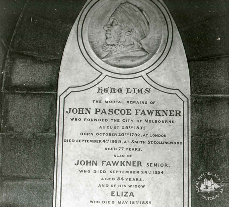 An image of John Pascoe Fawkner's head and neck, side-on, is carved into the pointed top of the text panel within a circle, with the text picked out in black underneath.