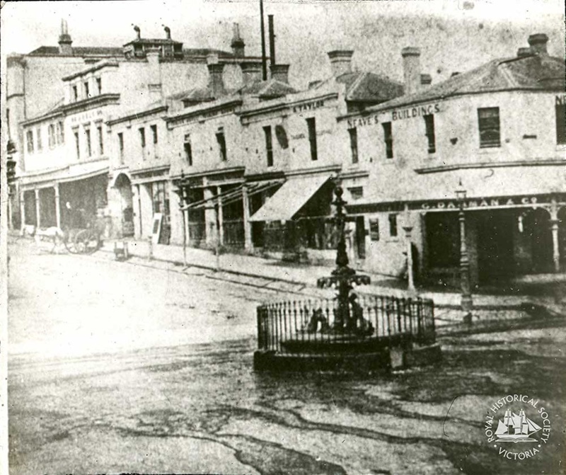 In the foreground is the Victoria Fountain which was officially turned on in August 1859. It was eighteen feet high and had six elegantly carved dolphins at its base. The fountain was in place for several years until traffic built up in the intersection and it had to be removed. A large crowd assembled to witness the inauguration of the fountain. A few years later, in 1867, a large crowd again assembled in this intersection to watch the Duke of Edinburgh lay the foundation stone of the Melbourne Town Hall. The same buildings can be seen in the background of GS-EM-67, an image taken at this event. (Also, Remembering Melbourne: 1850-1960, p. 166)