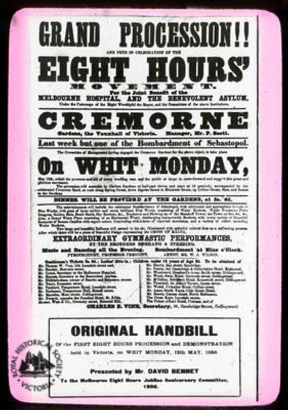 ORIGINAL HANDBILL / Of the FIRST EIGHT HOURS PROCESSION and DEMONSTRATION / held in Victoria, on Whit Monday, 12th May, 1856. / Presented by Mr. David Bennet / To the Melbourne Eight Hours Jubilee Anniversary Committee, / 1906"