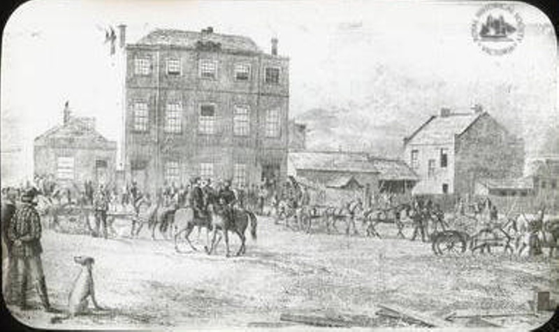 About this objectA lithograph of a busy street scene showing a gold escort, comprising of at least four wagons guarded by mounted and foot police, arriving in front of the first government Treasury offices located in William Street close to Flagstaff Gardens. This image at the SLV has the caption, "The Treasury, Melbourne / Arrival of the Monster Gold Escort", engraved by Thomas Ham.