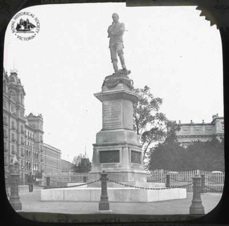 About this objectPhotograph taken from the southeast of the monument dedicated to General Charles Gordon of Khartoum. Designed by William Hamo Thornycroft, the over 3m high memorial has the bronze figure of the general in a contemplative stance on a tall square stone plinth. The monument was erected by the people of Victoria in 1887. The buildings along the west side of Spring Street, including the Windsor Hotel, can be seen in the background on the left, and the Treasury Building on the right.