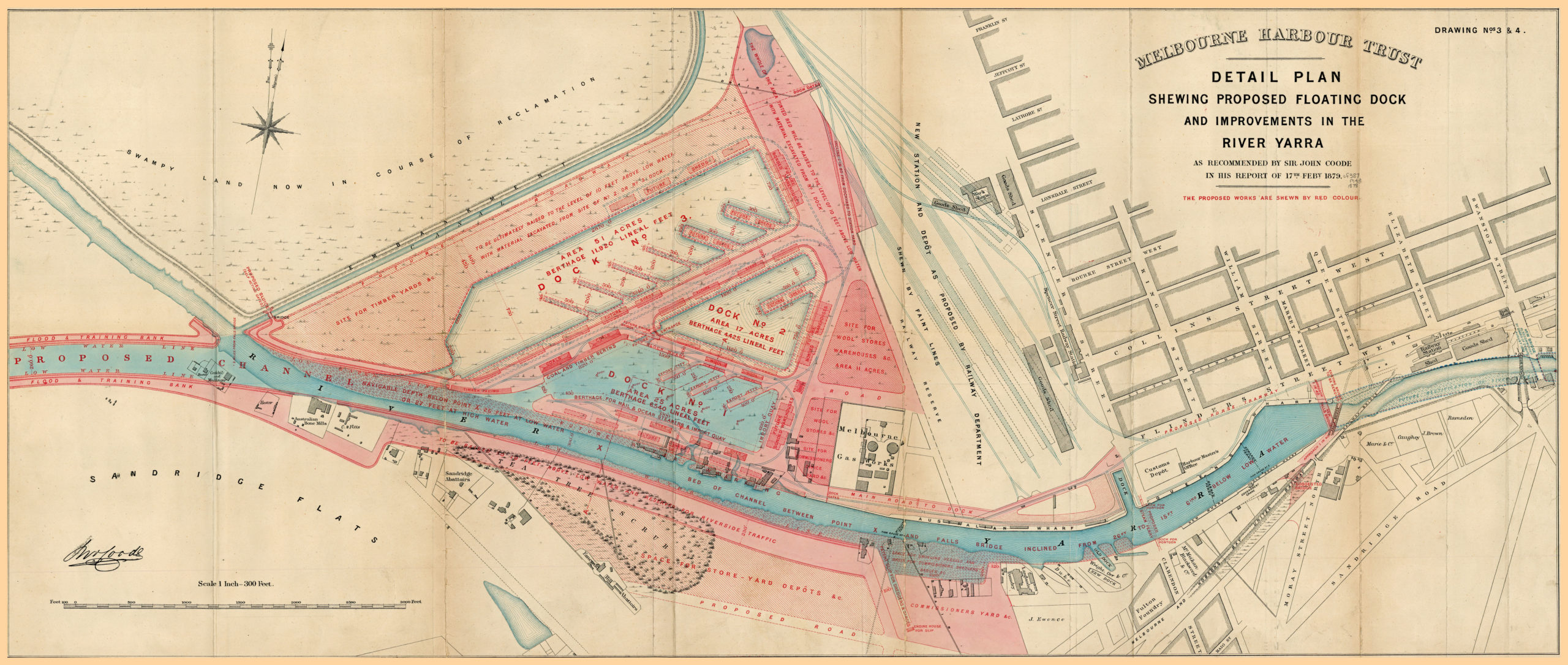 British engineer Sir John Coode was commissioned to design a canal and associated docking facilities. Coode came to Melbourne in 1878 to inspect the area, and his plans and reports were submitted in January 1879. The canal would not only allow a better passage for floodwaters, but it would prevent damage to wharf assets along the banks of the river. The soil excavated was to be used to raise the level of the ground surrounding the dock.