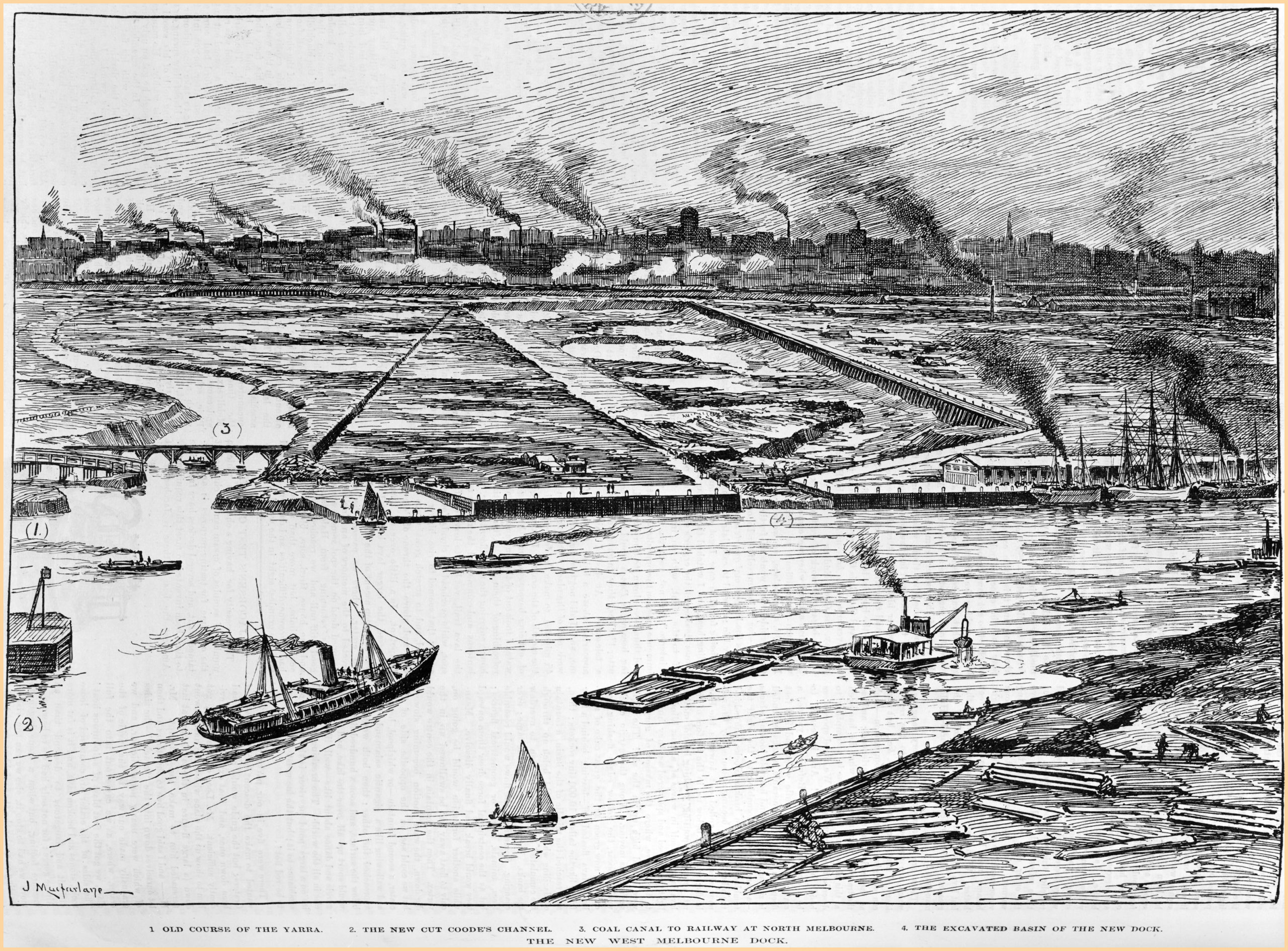 The Yarra was deepened and cleared of obstructions, and Coode Canal was excavated to eliminate the tight curve of the river at the lower reach.