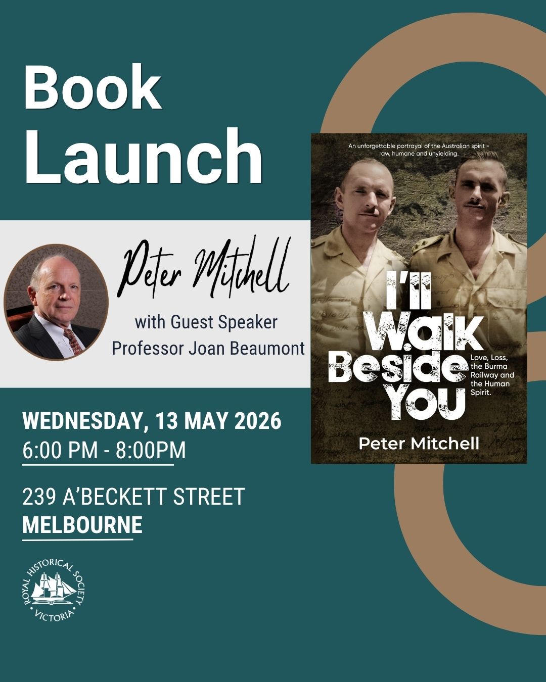 May 13 6:00 pm - 8:00 pm Book Launch – I’ll Walk Beside You by Peter Mitchell RHSV Gallery Downstairs 239 A'Beckett St, Melbourne Event Details Get Directions
